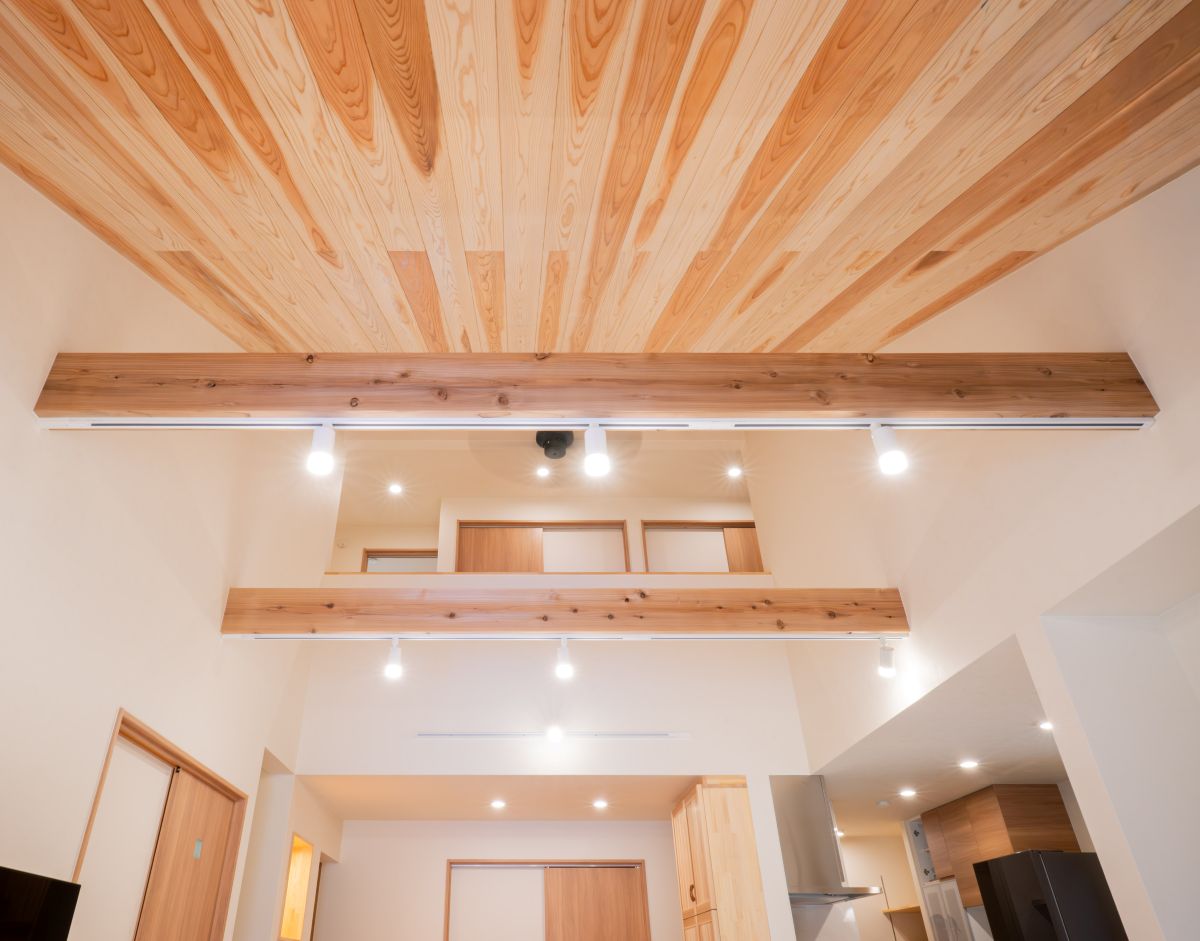 無垢材の梁表しと大黒柱が、平屋ならではの天井の抜けと木のあたたかさを感じさせてくれます。