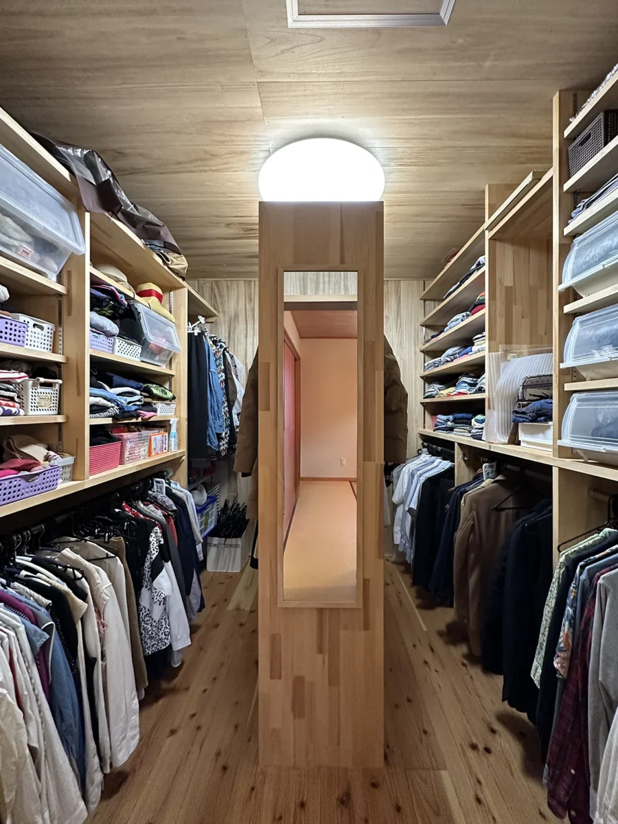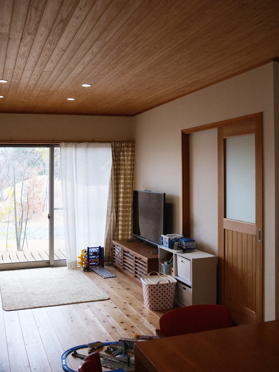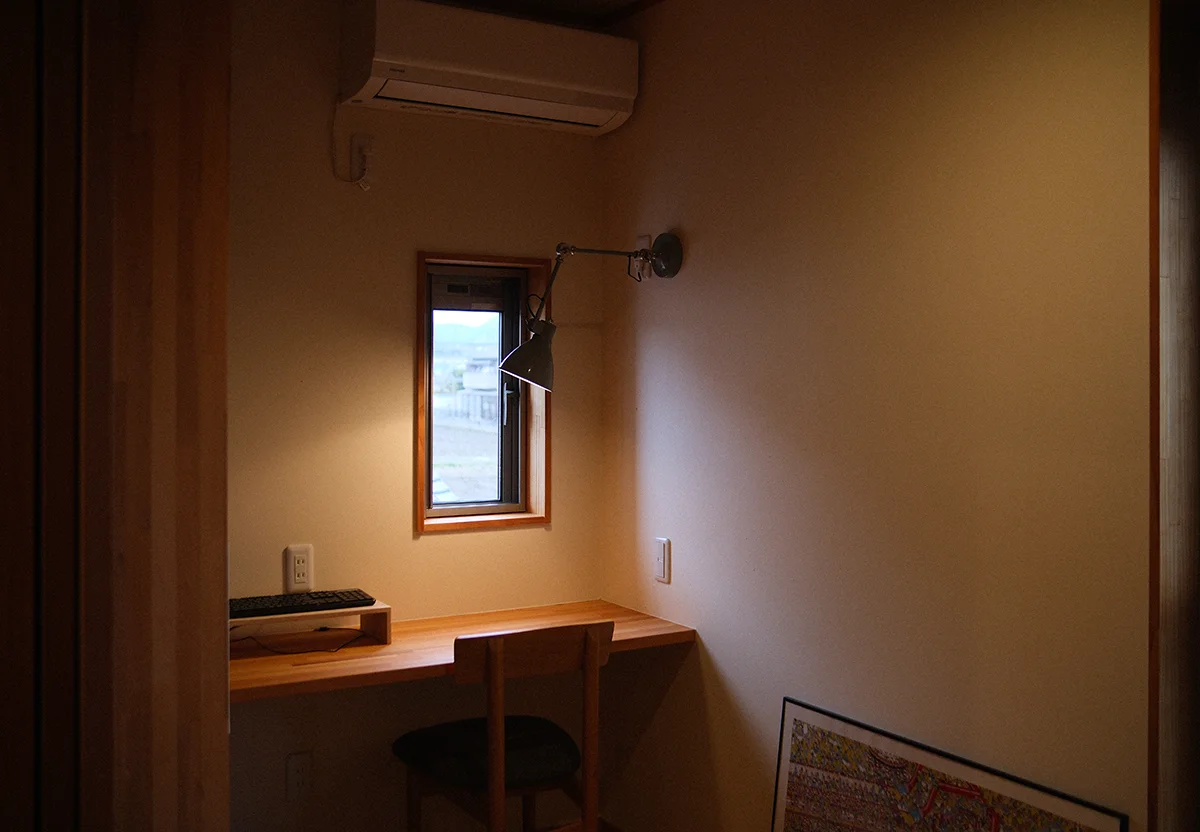A. ほんとは壁を珪藻土にしたかったんですけど予算がなく、代わりに珪藻土が混ざってるような感じの石膏ボードを選んでもらいました。そしてそれを活かすにはビニールクロスでは水分を通さないので、コットンのクロスで調湿しています。ただコットンのクロスは弱い、という話を聞いてたのでそこは心配してたんですけど、住んでみると問題なかったです。それにビニールクロスのあの嫌な臭いがまったく無くて。その代わり、いまだにお客さんに「木のすごくいい匂いがする」って言われるんですよ。そのせいか、よく考えてみればこの家に住み始めてからぐっすり眠れるようになりましたね。それまでは結構夜中に起きてたりしてたんですけど。