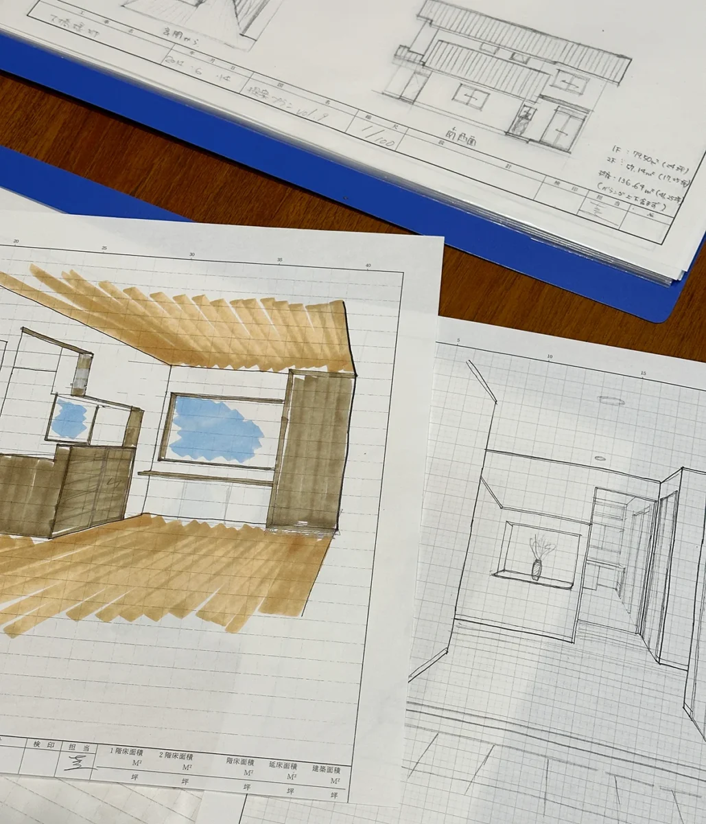 A. いやもう、挙げるとキリがないです(笑)。でもやっぱり、一つ一つの造作ですかね。たとえばクローゼットとか、設計士さんから事前に「中に何を入れたいですか?」って質問を頂いて、そこから作ったので。他にもアイロン立てとか、PCデスクとか、一つ一つに僕らが思いつかないような工夫があったりして。しかも最初に決めたものをつくるんじゃなく、現場で様子を見ながら、建てながらこの高さどうしましょうとか、そういう進め方をしてくれたんです。素人って寸法言われてもイメージ湧かないじゃないですか。だから現場で見ながら意見が言えたのがありがたかったですね。さらに僕らが言ったことや堤さんが仰ったことをぱーっとイラストにしてくれるんですよ。あれはすっごくイメージしやすかった。今もそのイラストは全部記念に取ってありますよ。